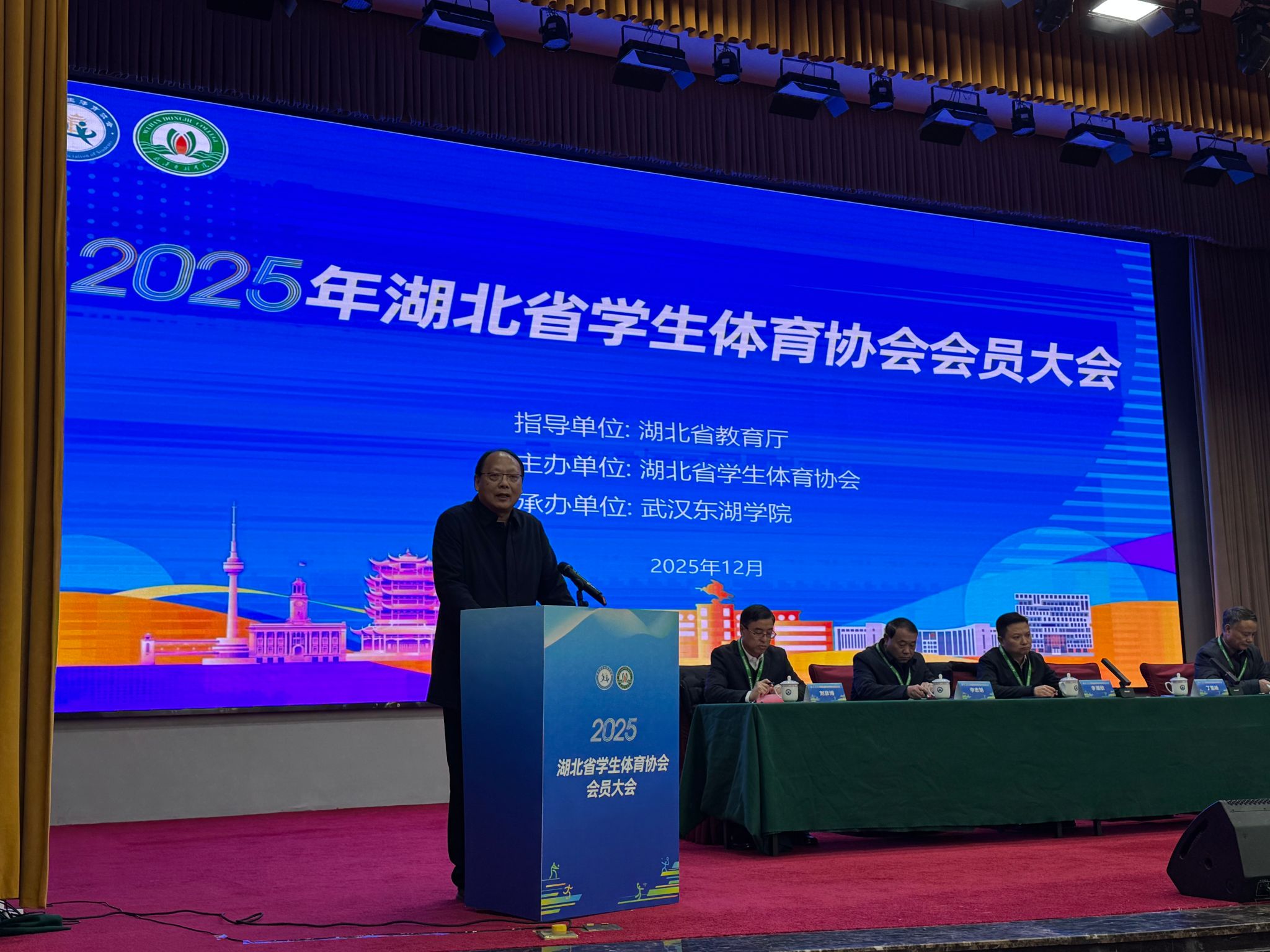 (通讯员 乐建军)12月27日,2025年湖北省学生体育协会会员大会在武汉东湖学院召开。中国学生体育联合会副主席华爱军,省教育厅体卫艺处处长丁雪峰,协会副理事长、武汉工程大学党委副书记李志旭,协会副理事长、武汉体育学院党委副书记刘彦博,协会副理事长、湖北民族大学副校长李军,协会副理事长、三峡大学副校长黄悦华,协会副理事长、江汉大学副校长李卫东、武汉东湖学院校长黄泽波等领导嘉宾出席大会,全省各市州教育局、普通高校及215名会员单位代表出席会议。我校体育部书记、主任、湖北省学生体育协会副秘书长万莉莉,湖北省学生体育协会棋牌单项委员会副主任乐建军参加了本次会议。大会由武汉体育学院党委副书记刘彦博主持。