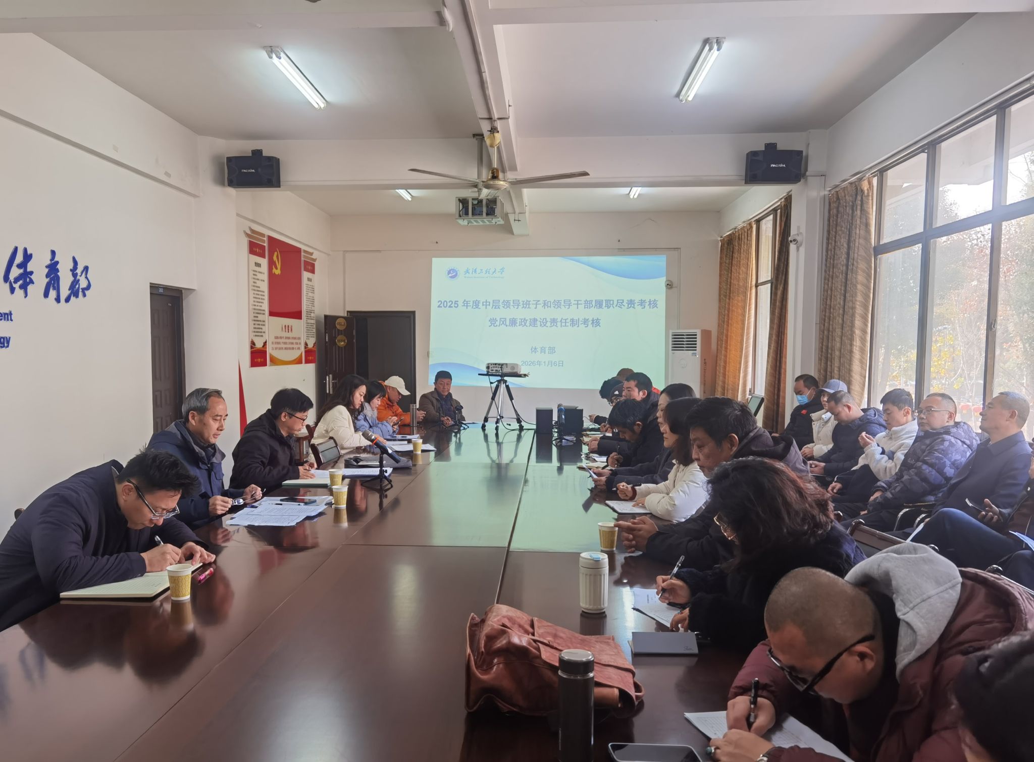 (通讯员 陈琰)2026年1月6日上午,2025年度领导班子和领导干部履职尽责、党风廉政建设责任制考核会。学校第四考核组副组长计划财务处处长熊杰、兴发矿业学院与资源与安全工程学院党委书记江本武,组员王乐凯、朱雪洁莅临实施考核,体育部领导班子、全体教职工参加会议。