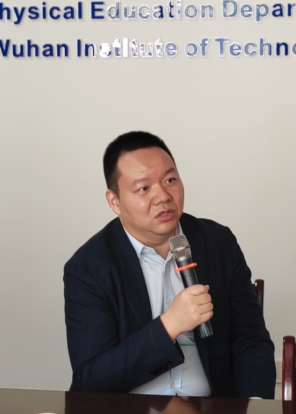 (通讯员 陈琰)2026年4月17日上午,体育部第十三届“工大学术周”第二场专家讲座在体育部二楼会议室201成功举办。本次讲座由体育部教学主任贺新家主持,特邀江汉大学吴钰祥教授作专题报告,主题为主动健康视域下的智能体育——场馆、器材与穿戴设备的协同创新。体育部全体教师、体育经济管理专业研究生及热爱体育文化的本科生到场聆听学习。